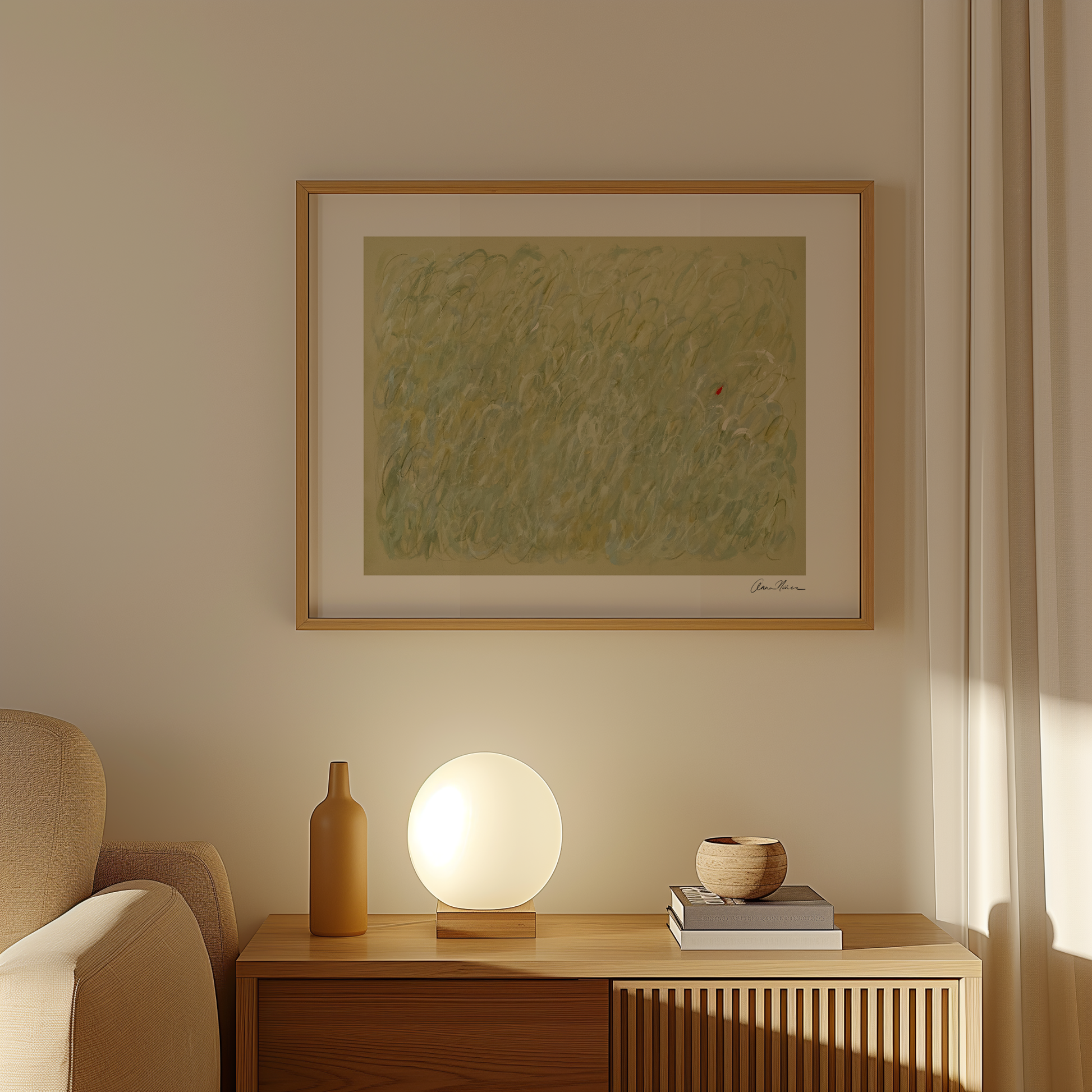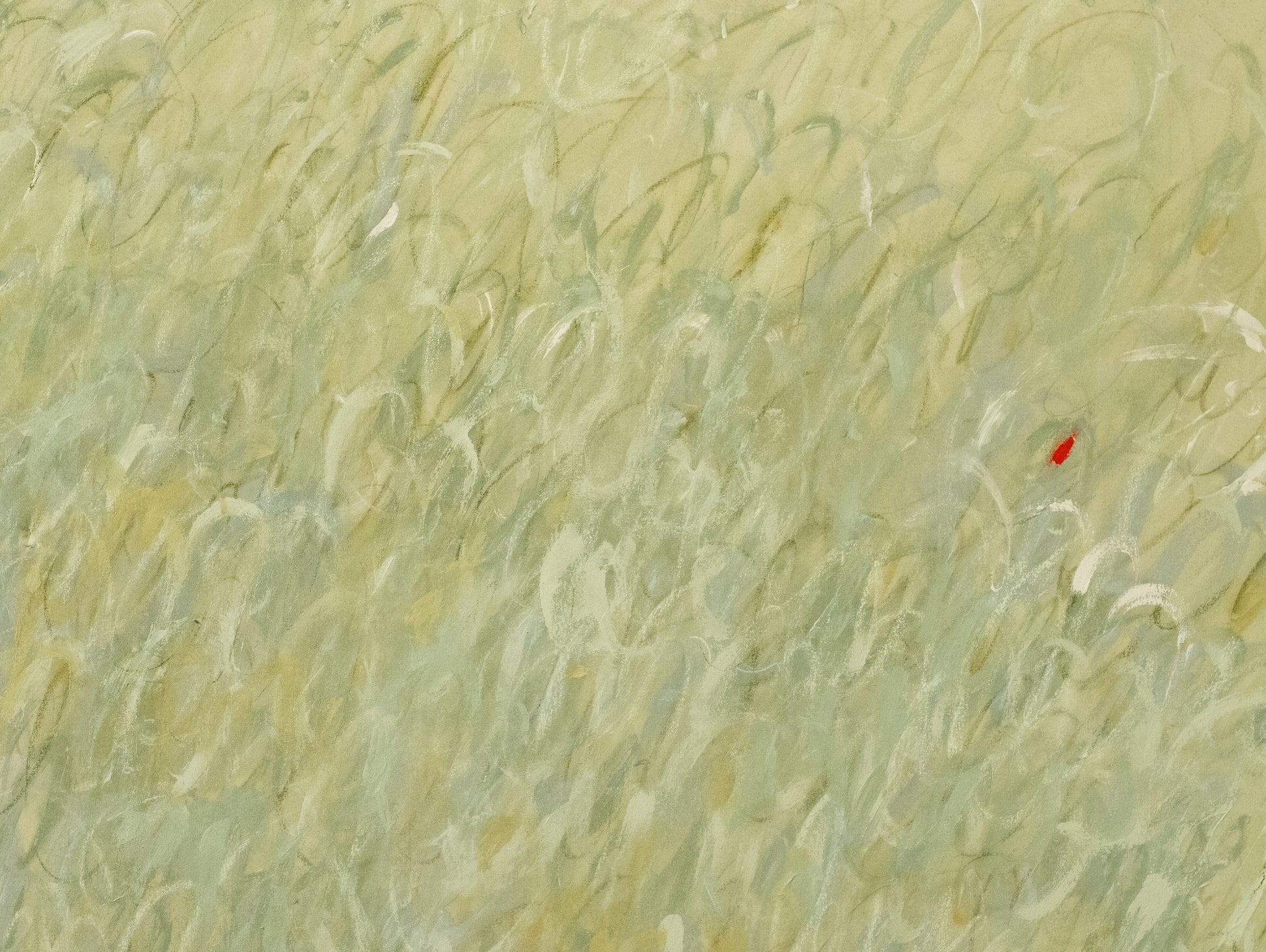 Breathe feels like a long exhale — that gentle, grounding moment when the world slows down long enough for you to notice the quiet beauty around you. Soft, layered strokes in muted greens and warm neutrals create a sense of calm, like sunlight drifting through tall grass or a peaceful field just before dusk. The tiny touch of red tucked within the movement feels like a heartbeat, a reminder of God’s presence, of something sincere and meaningful. This piece brings serenity into any room, inviting you to pause and simply breathe.
