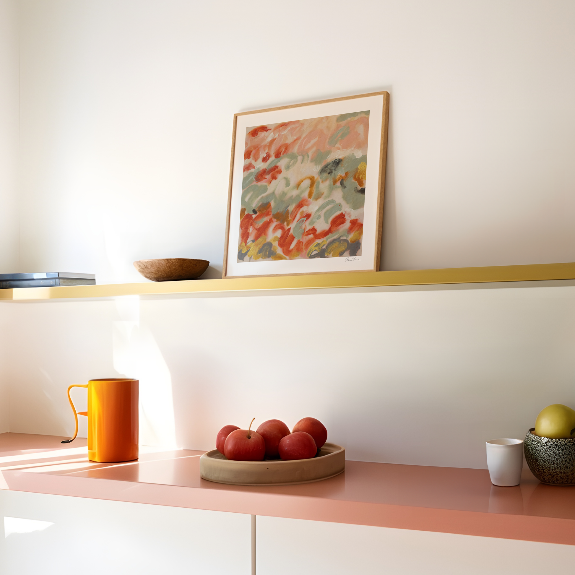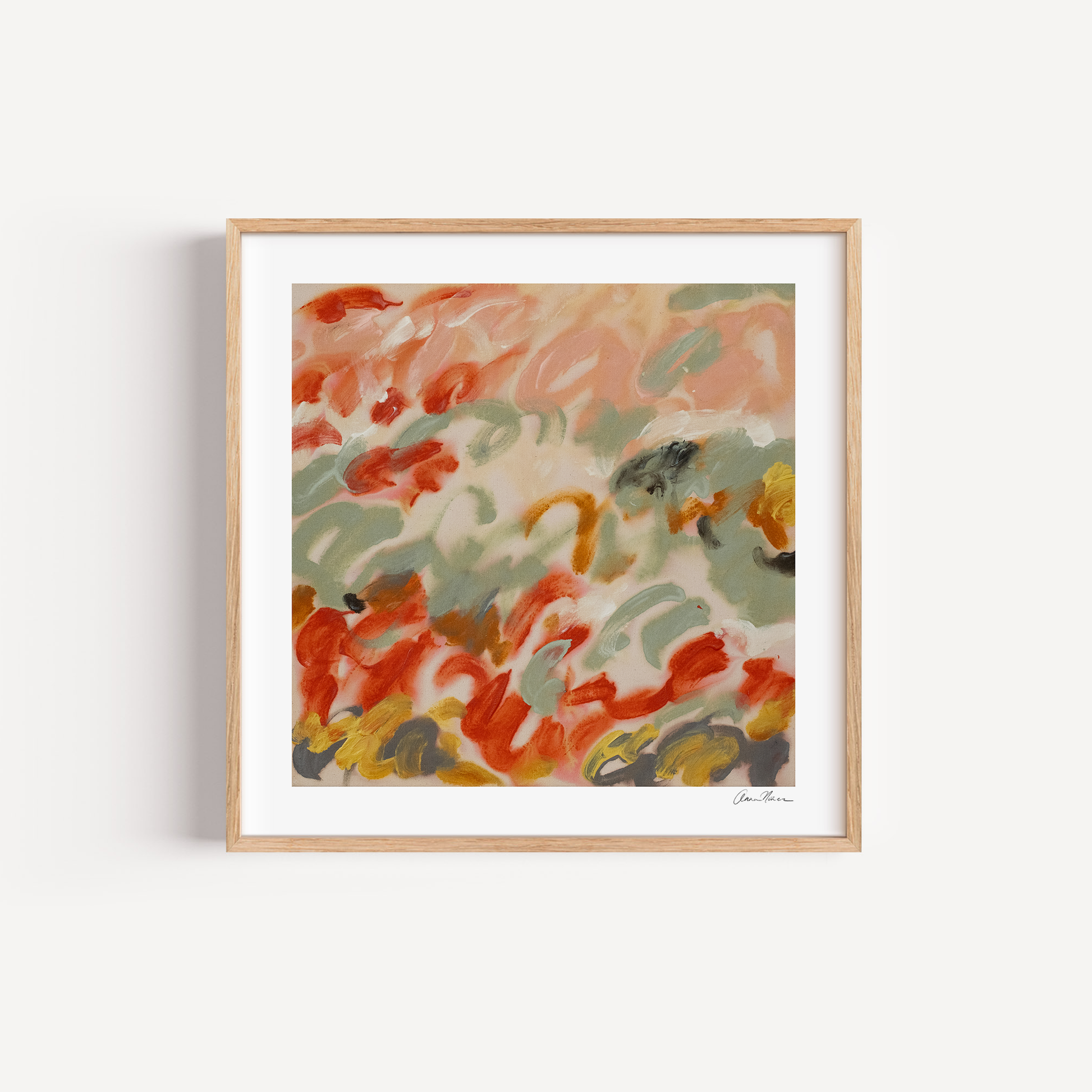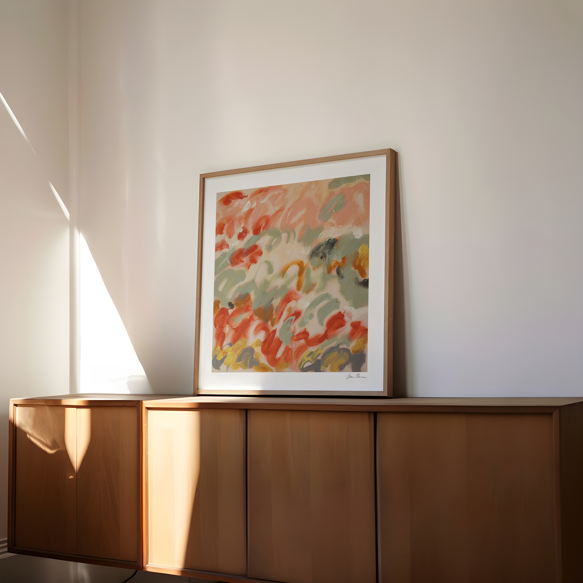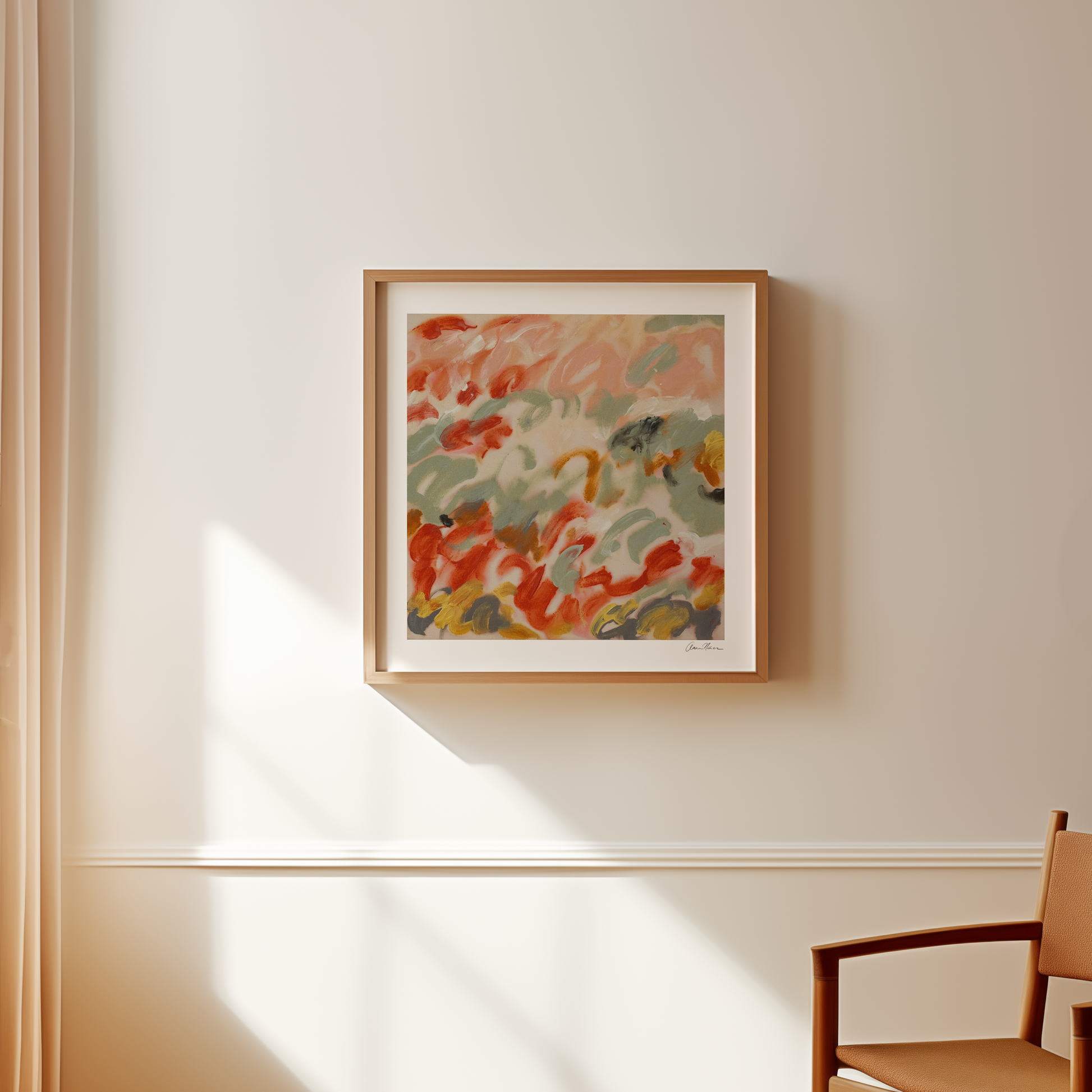 Sobremesa is inspired by those long, lingering moments around the table — when the meal is technically over, but no one wants to leave because the company and conversation feel too good. The warm peaches, soft greens, and vibrant reds move like laughter shared over dessert or stories told long after the plates are cleared. There’s a sense of ease and connection woven into every stroke, capturing the joy of being fully present with people you love. This piece brings that same inviting, heart-full energy into any space.