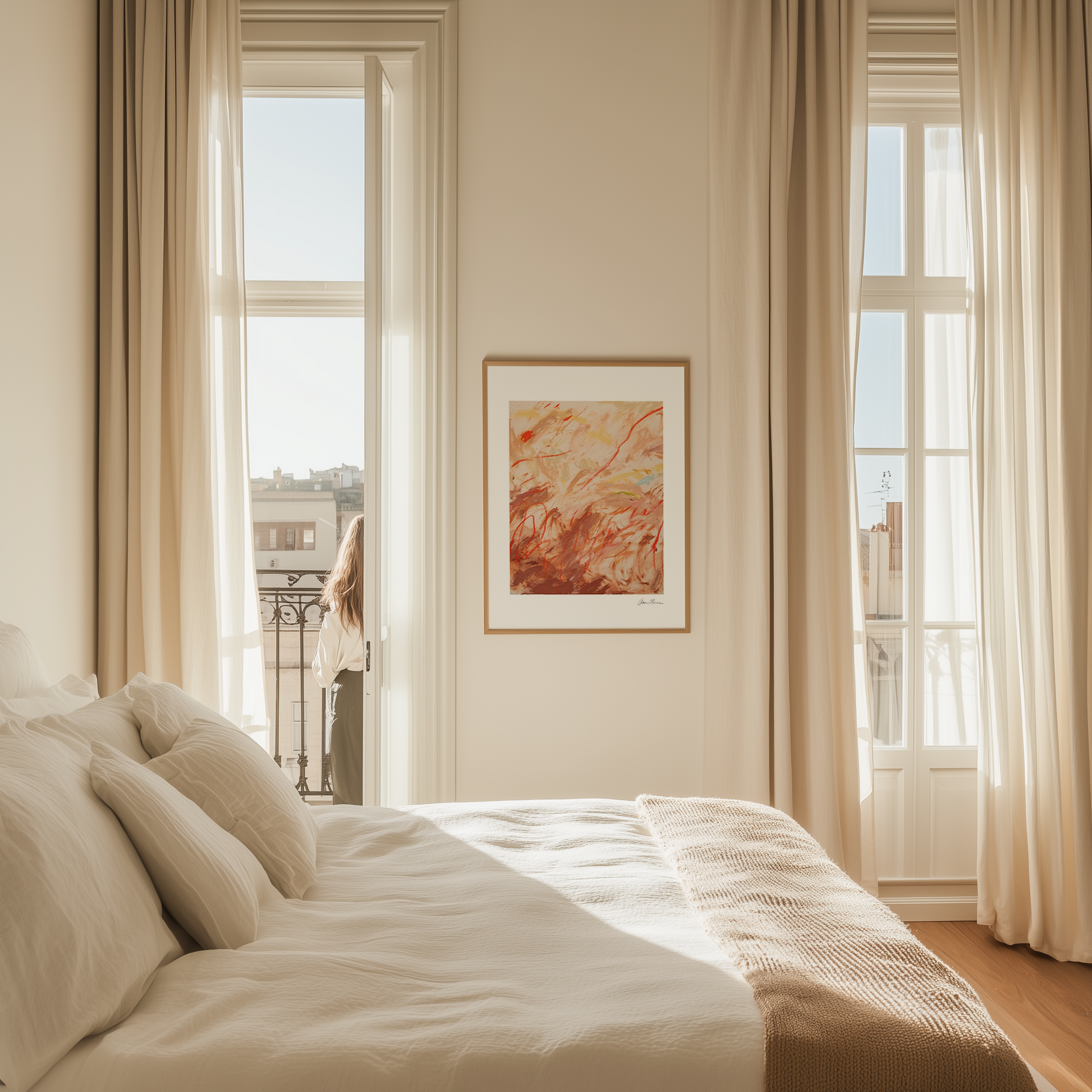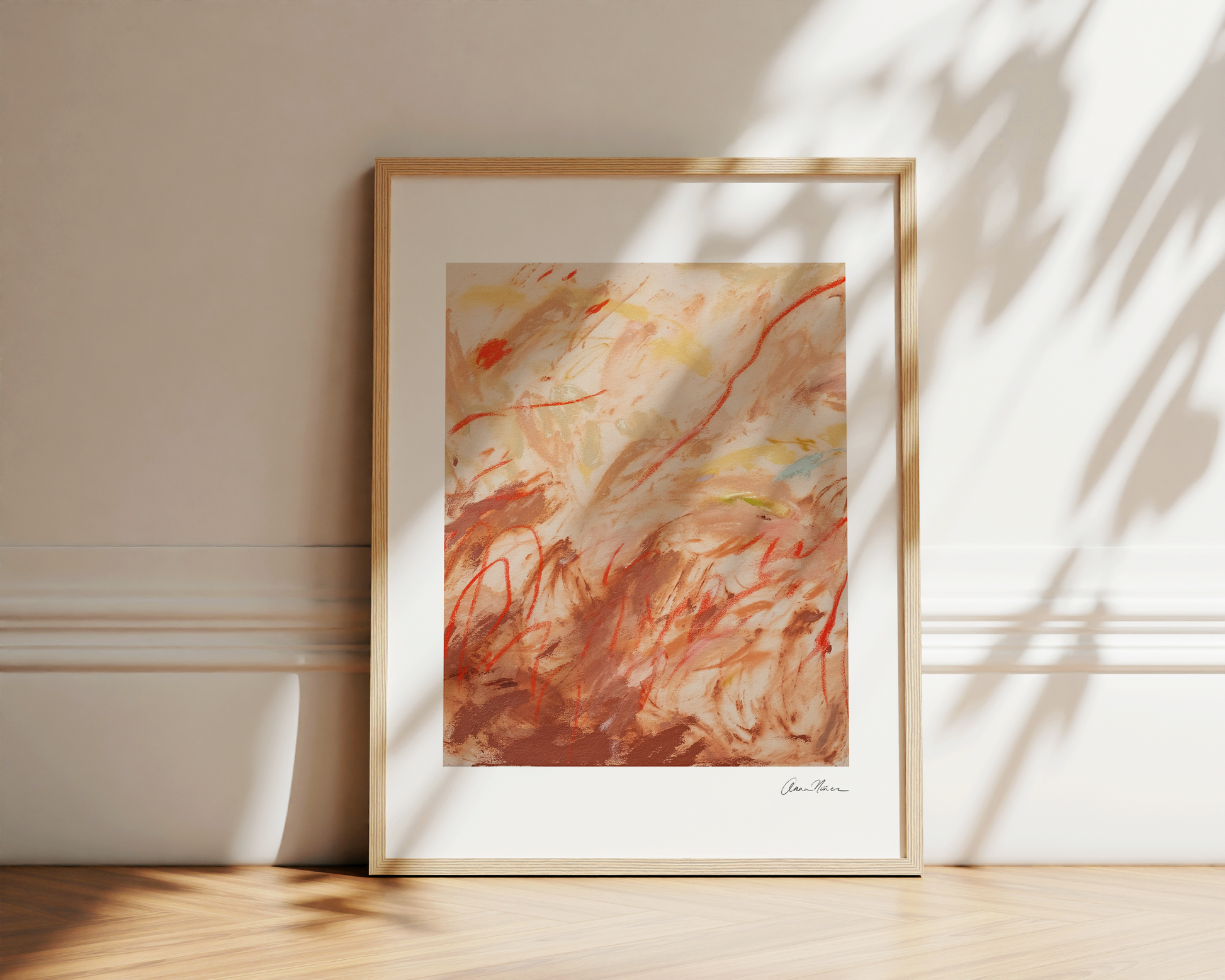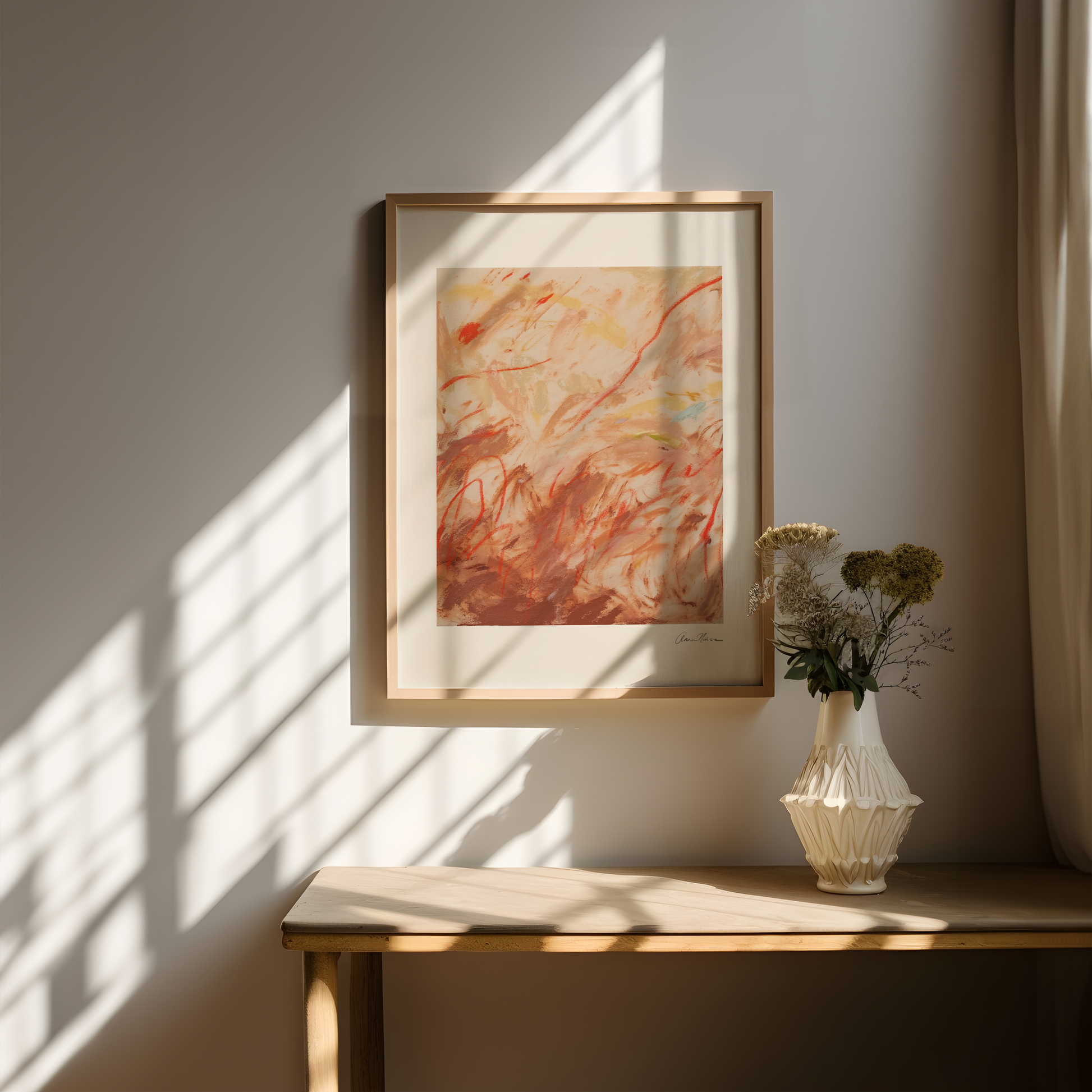Strawberries in Spring is filled with the warmth and sweetness of a season just beginning to bloom. Soft peach tones, vibrant reds, and airy gestures create the feeling of sunlight spilling over fresh fields — light, playful, and full of new life. There’s a sense of joy woven into the movement, like the first warm day after winter when God gently reminds you that renewal always comes. This piece brings a bright, hopeful energy to any space, inviting you to savor the simple, beautiful moments.